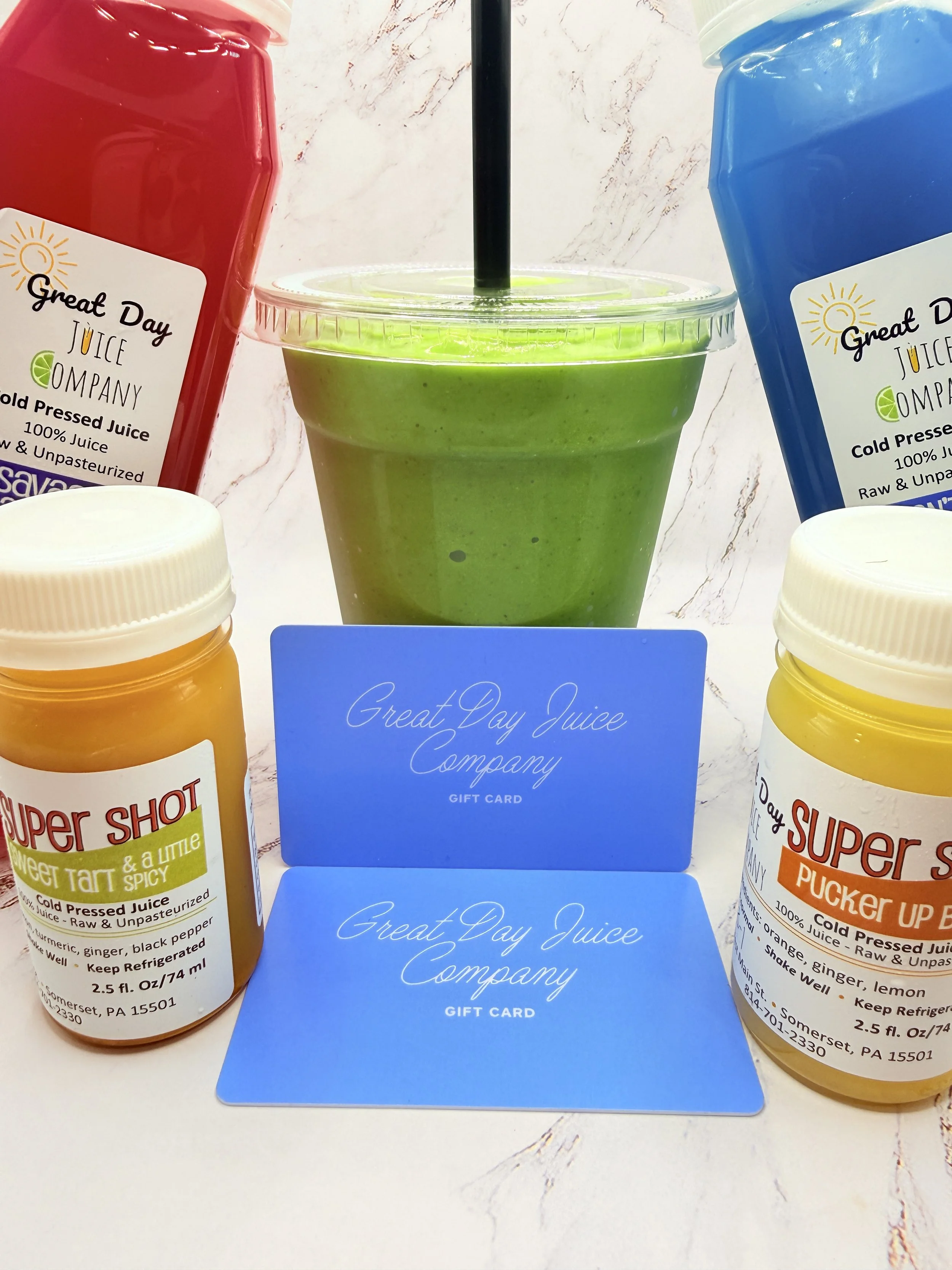 Share the joy of wellness with a Great Day Juice Company gift card. It’s a thoughtful way to treat someone to nourishing superfood bowls, refreshing juices, and energizing cleanse options—perfect for anyone who could use a little boost in their day. Reloadable plastic gift cards available in-store, or conveniently purchase an e-gift card using the button below