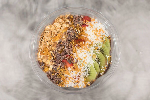 What’s a smoothie bowl? It’s a creamy blended, partially frozen base, similar to a smoothie but thicker, that is topped with fresh ingredients and eaten as a meal. Like all of our menu items, we strive to provide a range of flavors. We have banana based bowls, tropical based smoothie bowls, and the ever popular Açai bowls. What makes ours different? We NEVER use sorbets with added sugars or preservatives. We blend frozen fruits with almond milk and ingredients like flax and chia seeds to create the perfect creaminess with the perfect flavor. Each bowl is then topped with a variety of fresh fruits; superfoods like hemp hearts, coconut shreds, or nuts/seeds; our gluten-free house made granola; and a drizzle of local maple syrup, pure peanut butter, or raw local honey to top it off. We know you will fall in love with one of these flavors, but you really have to try them all!